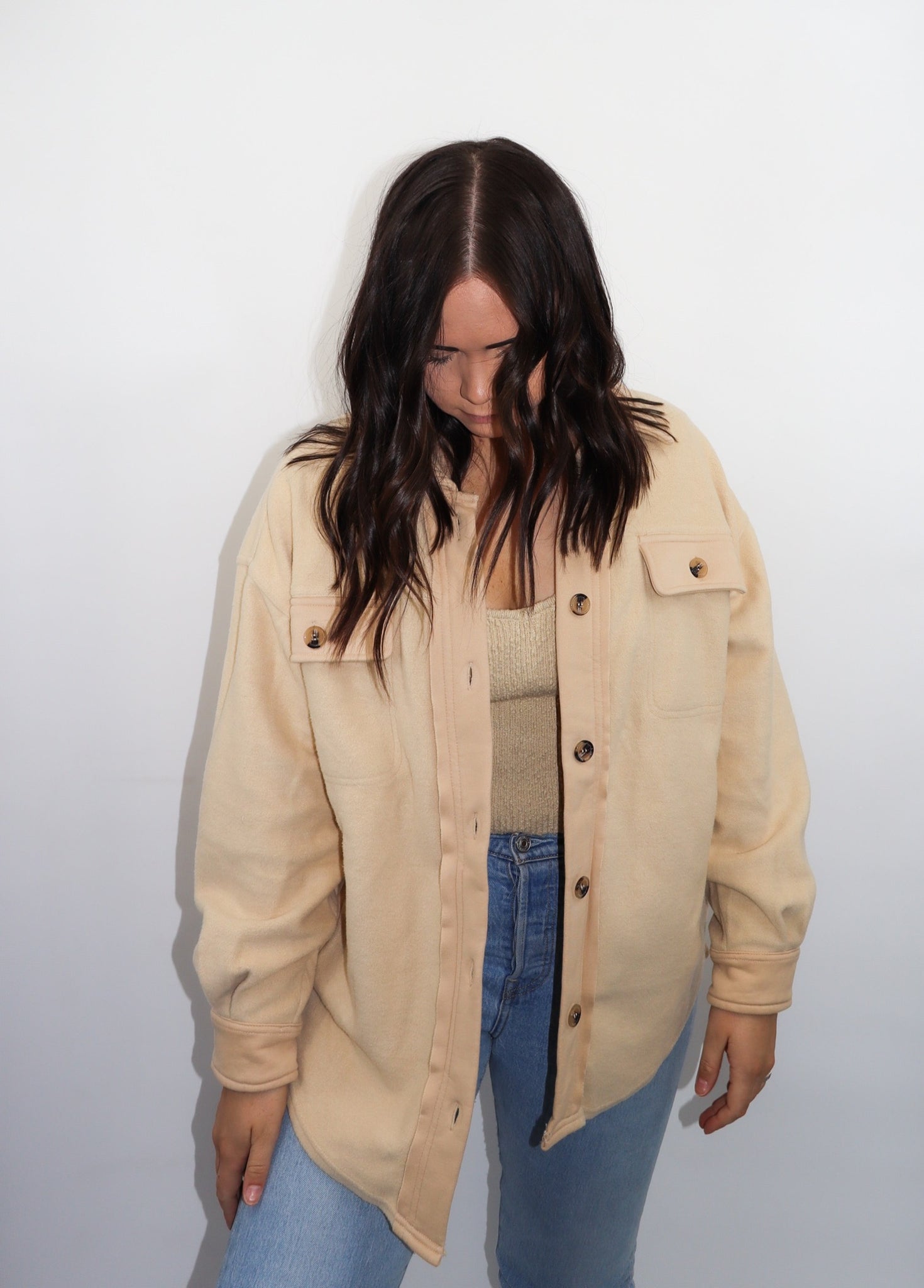 model wearing the until then jacket. model has the jacket paired with a pair of denim and is looking downward.