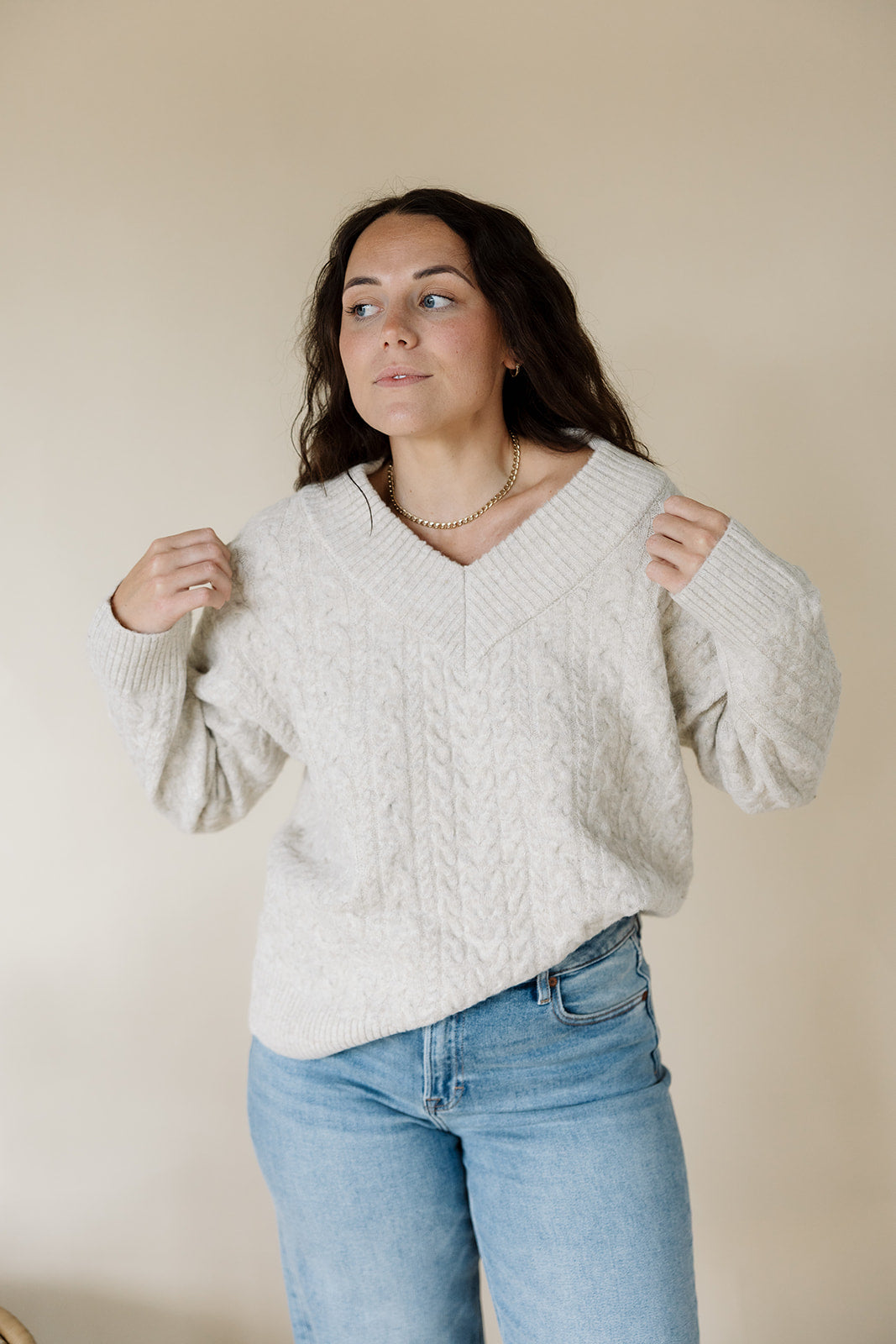 heathered taupe cable knit sweater with v-neckline, dropped shoulder, and relaxed, oversized silhouette
