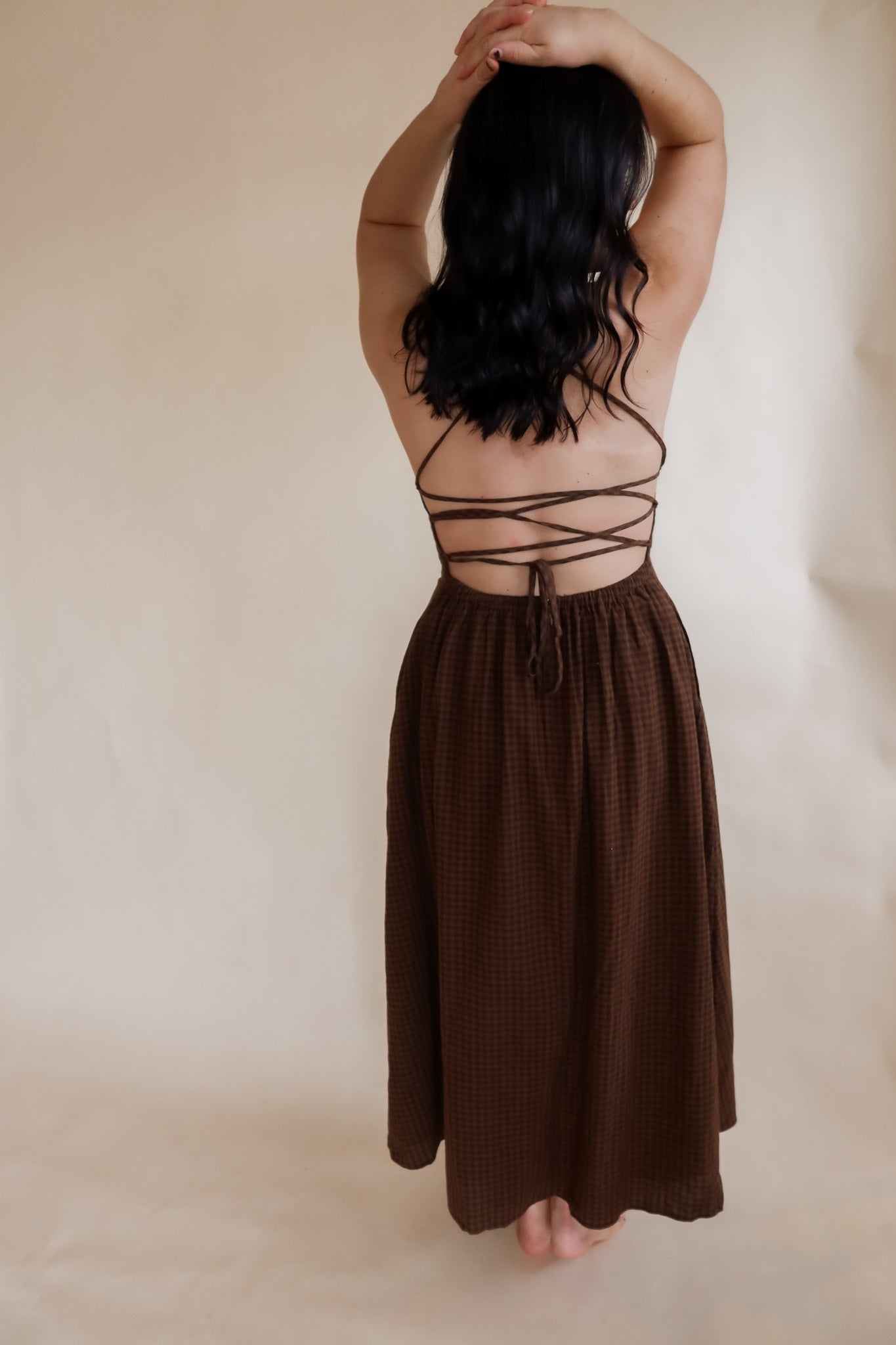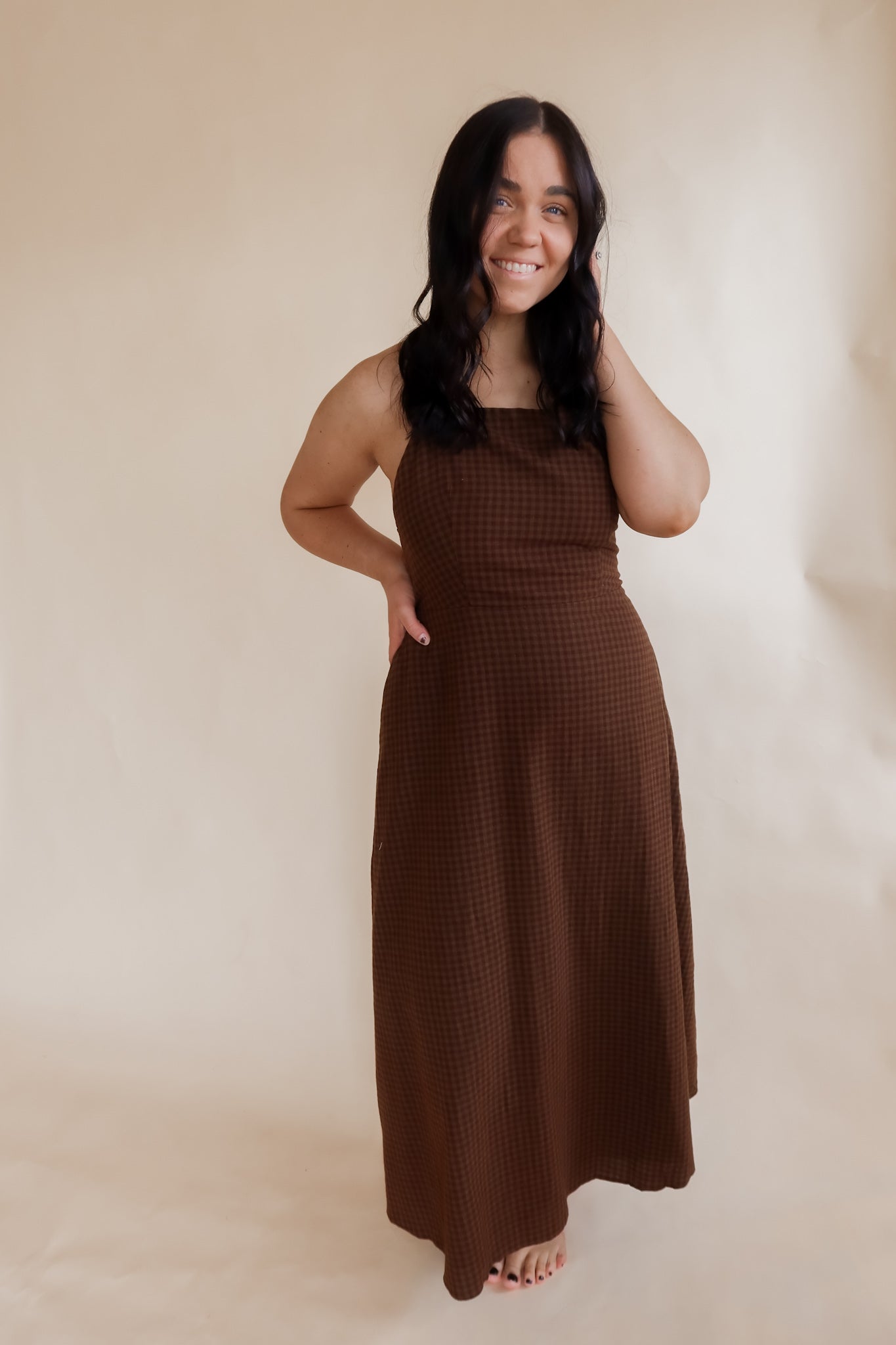 - gingham ankle length maxi dress with square neckline, half elastic waistline, and functional criss cross tie back