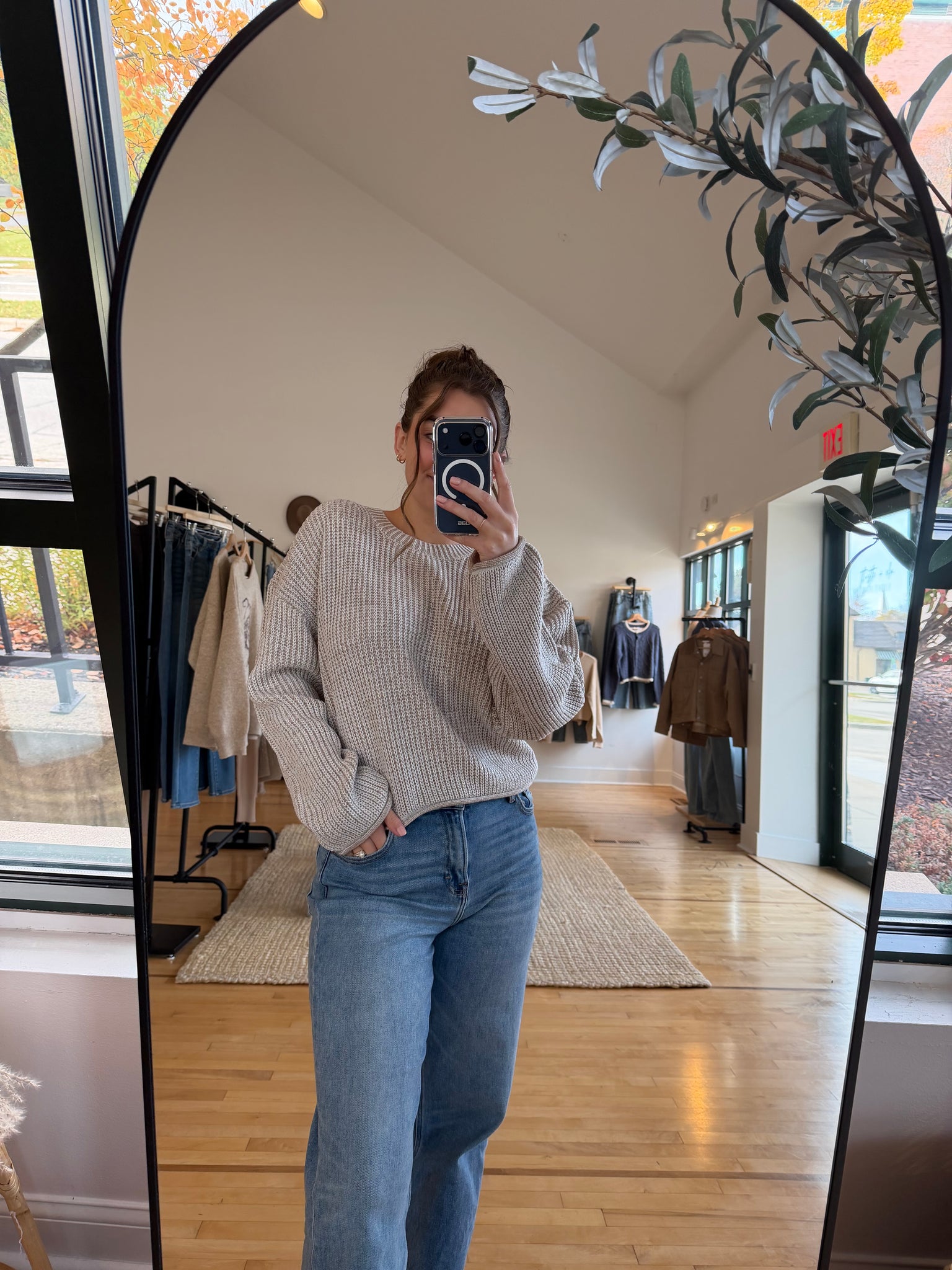- taupe + cream ribbed knit sweater with cropped silhouette, dropped shoulder + classic round neckline