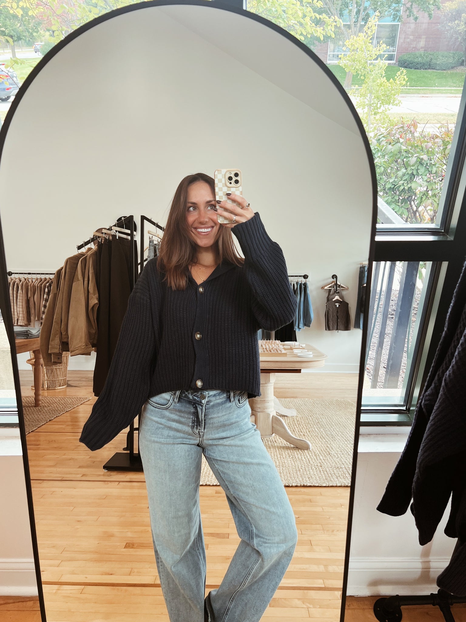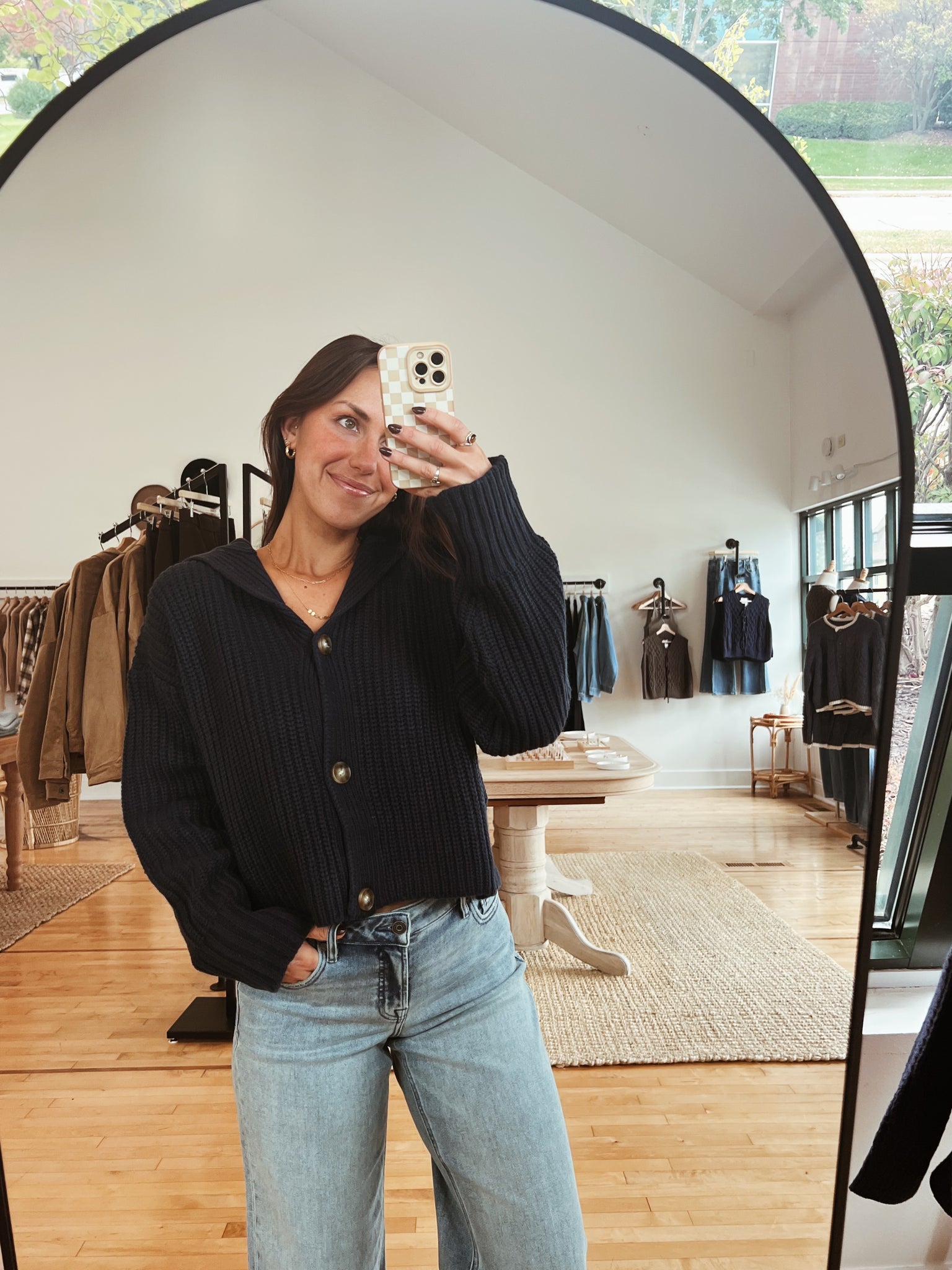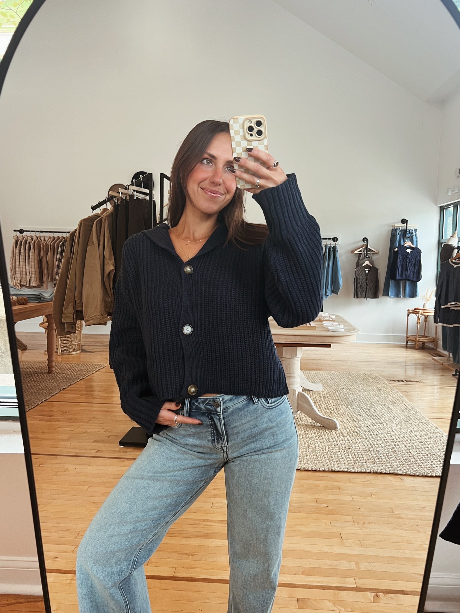 button front knit sweater with totally trendy sailor collar, dropped shoulder + meet-and-greet silhouette