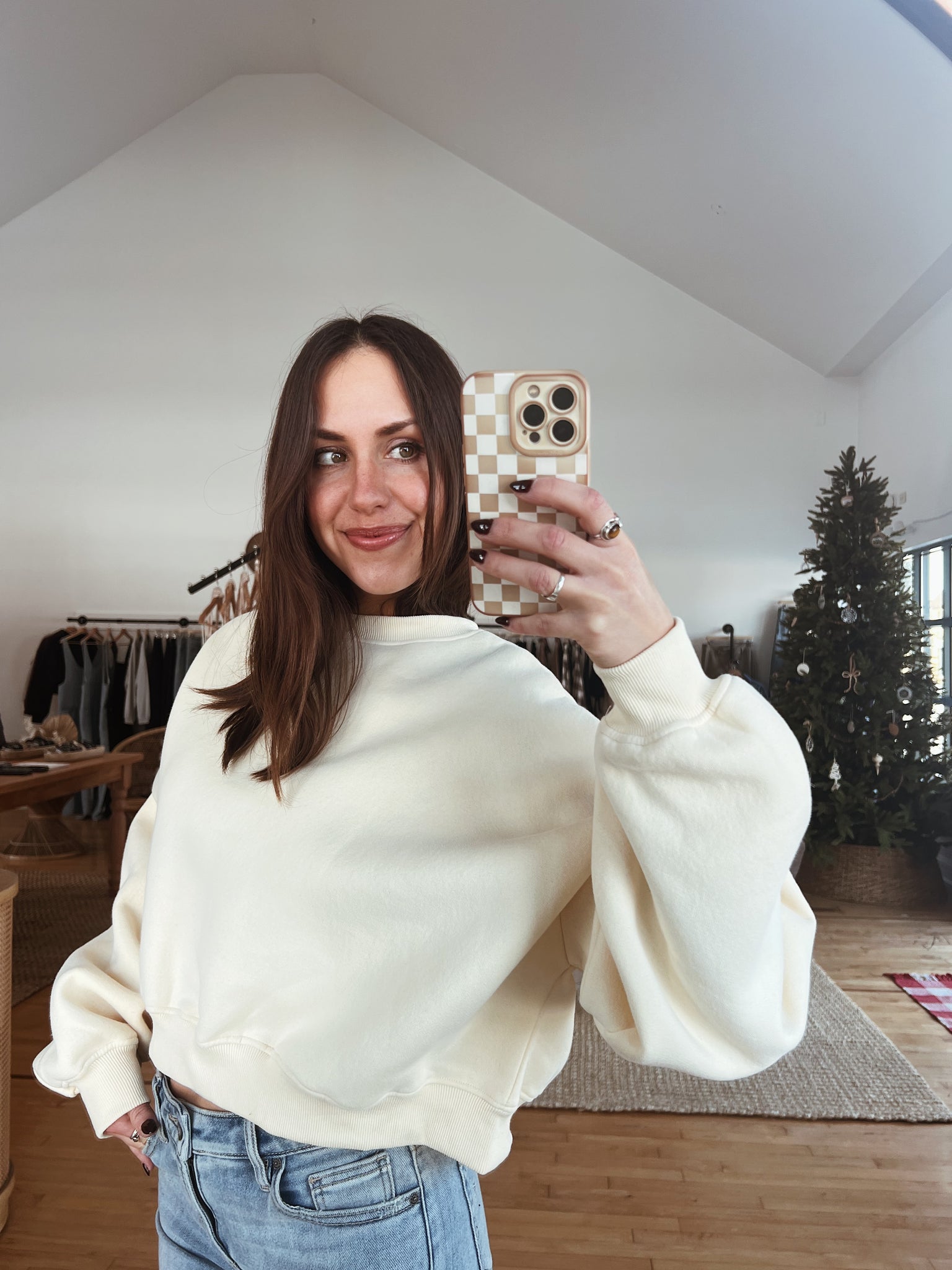 buttery soft, fleece lined crew neck sweatshirt with relaxed, cropped silhouette