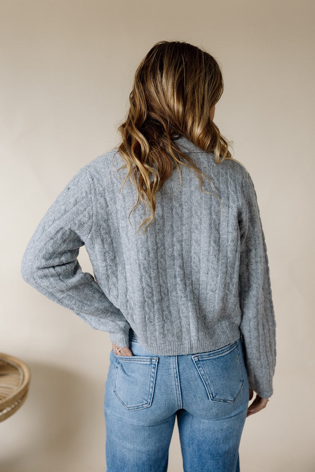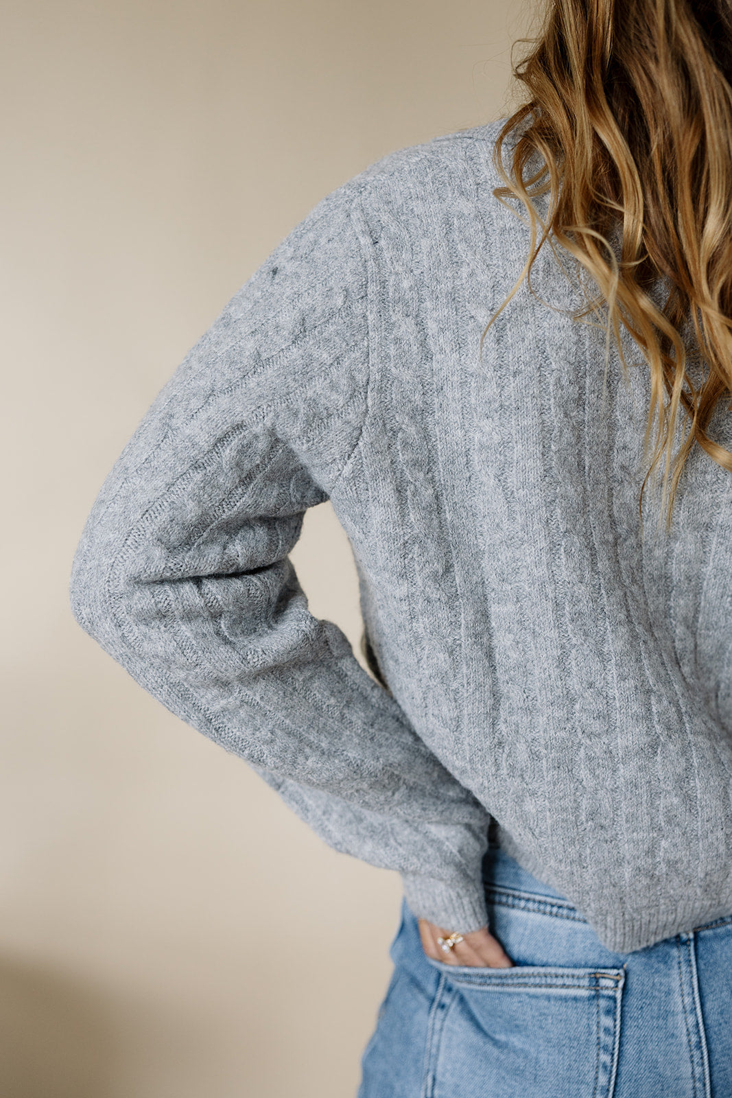 grey soft cable knit sweater with v-neckline and structured collar detailing