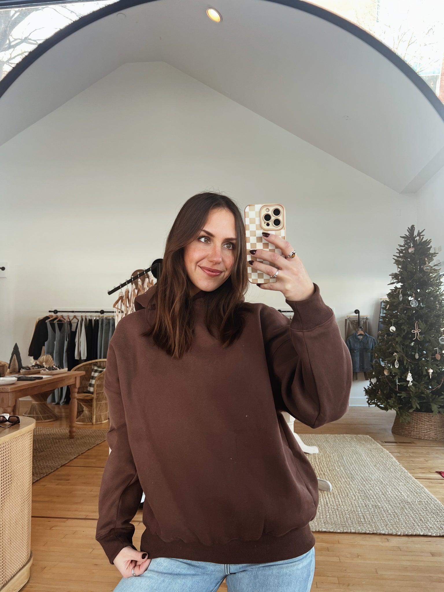 buttery soft, fleece lined hooded sweatshirt with relaxed, oversized silhouette