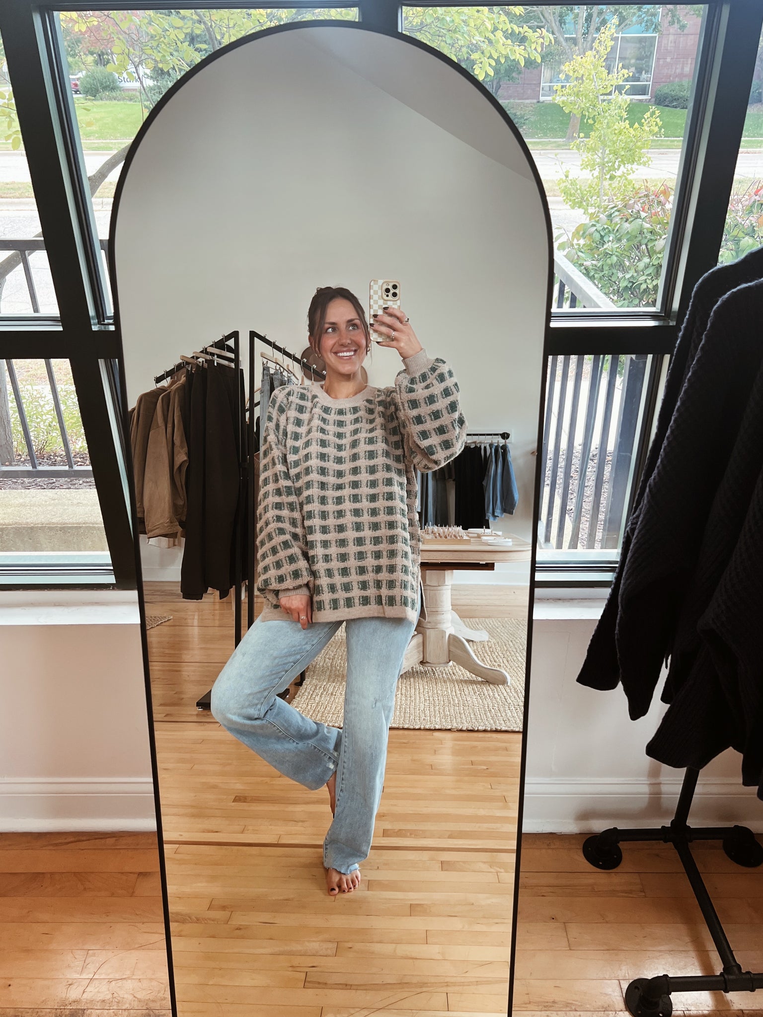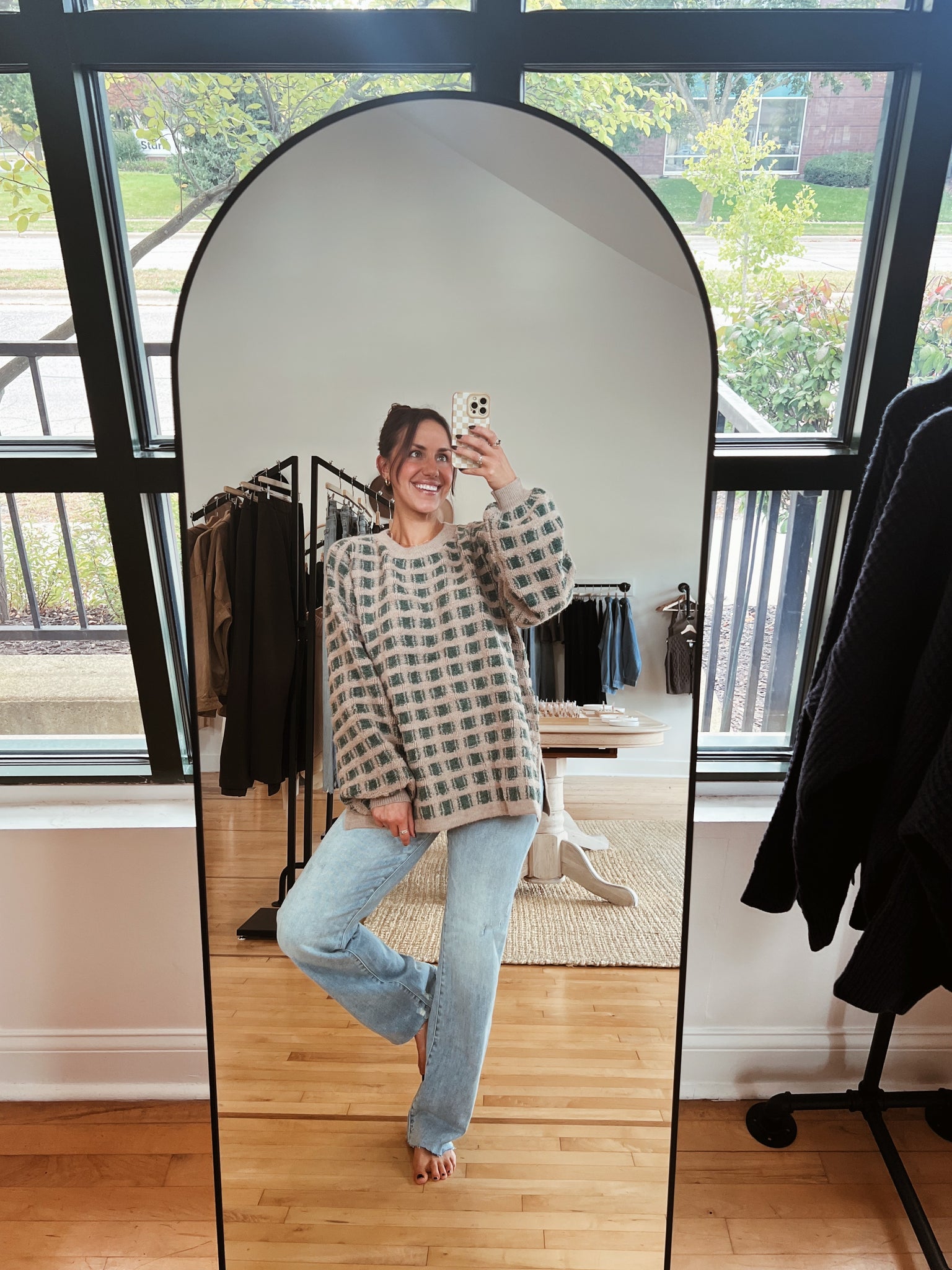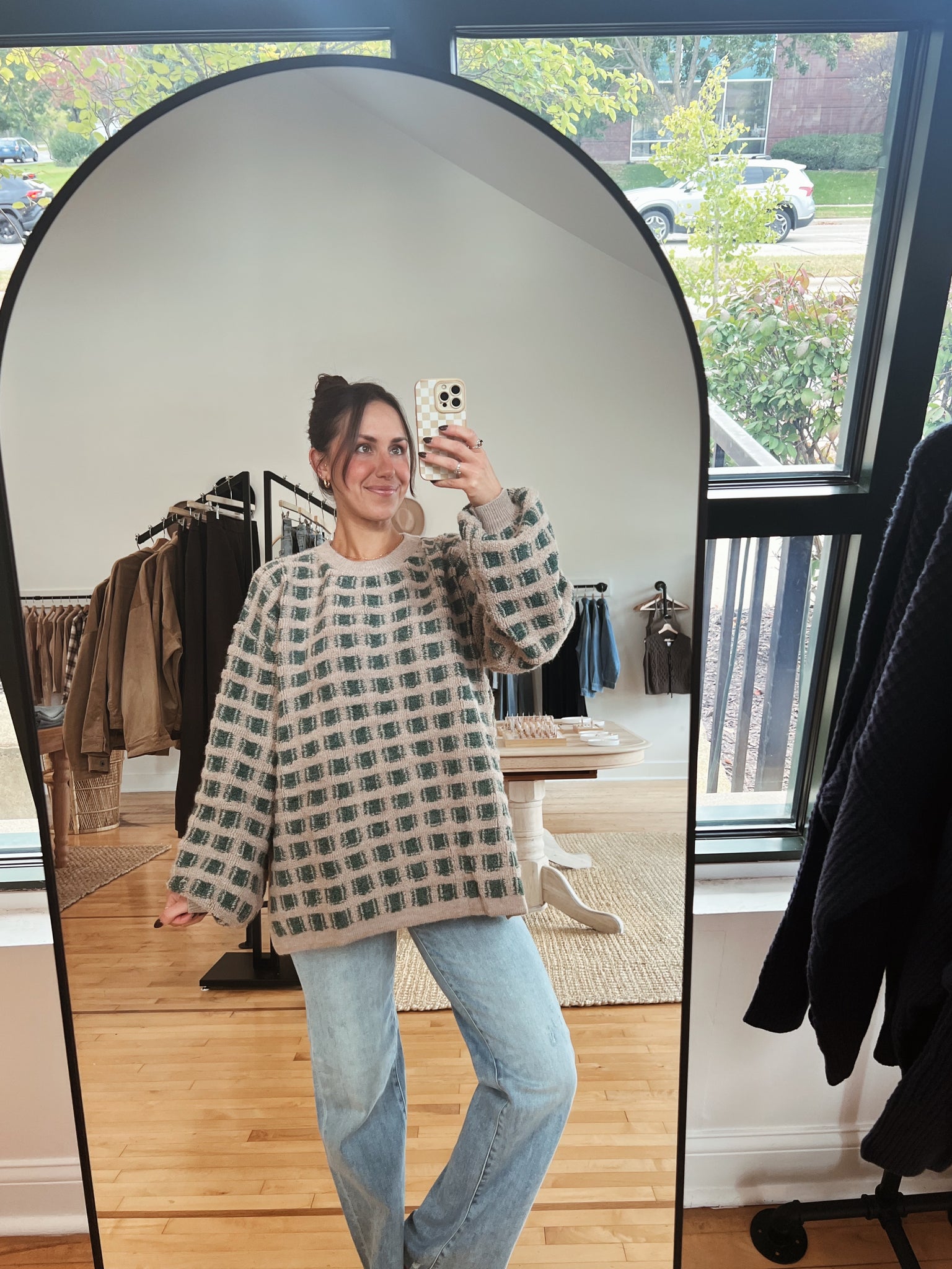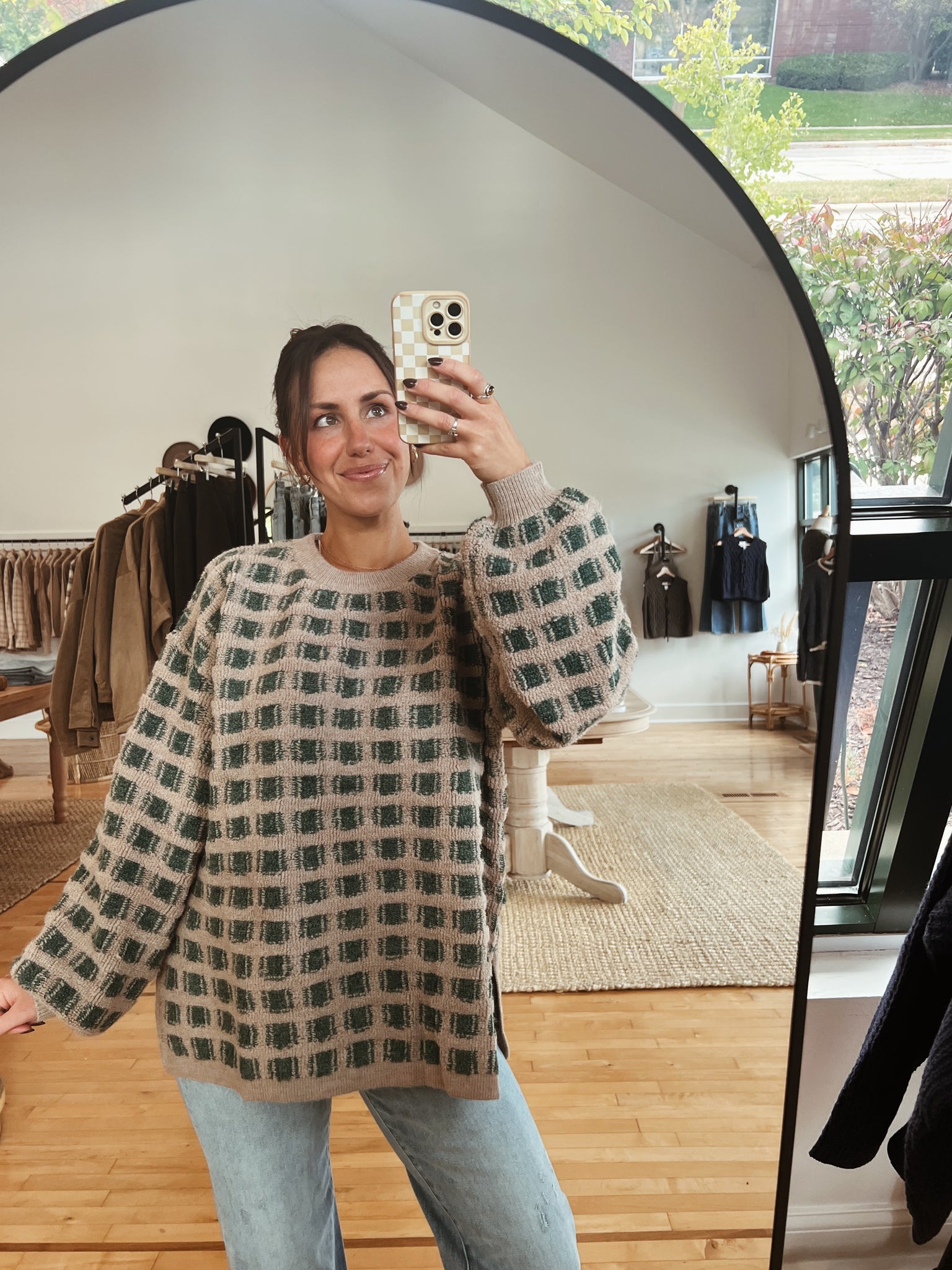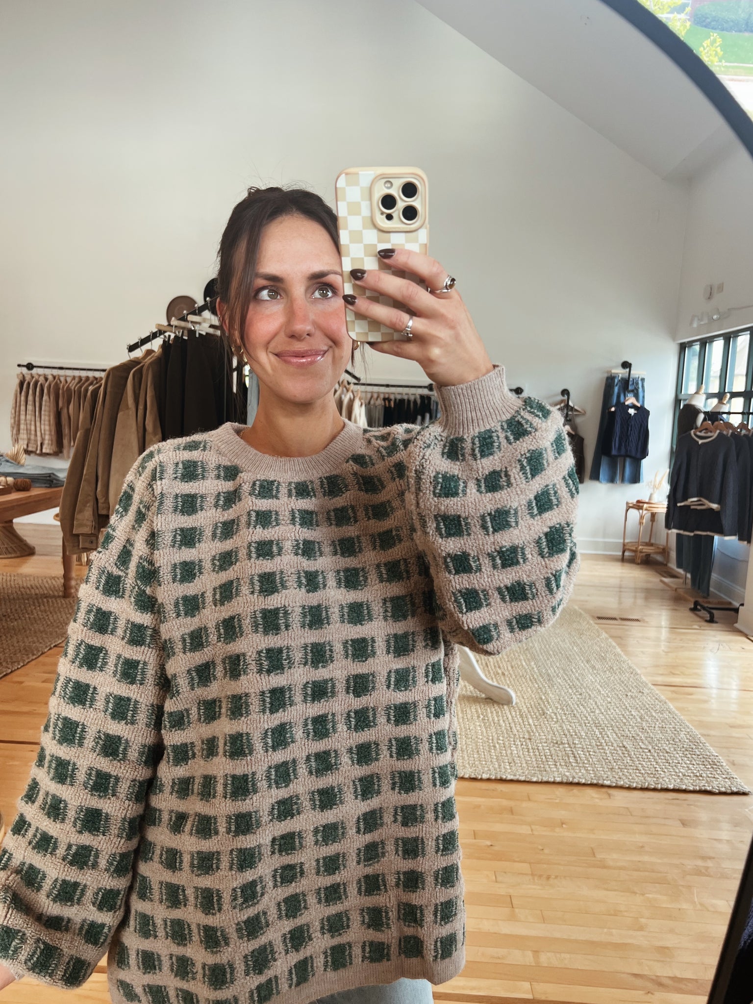 olive + taupe checkered sweater with classic round neckline + oversized, longline silhouette