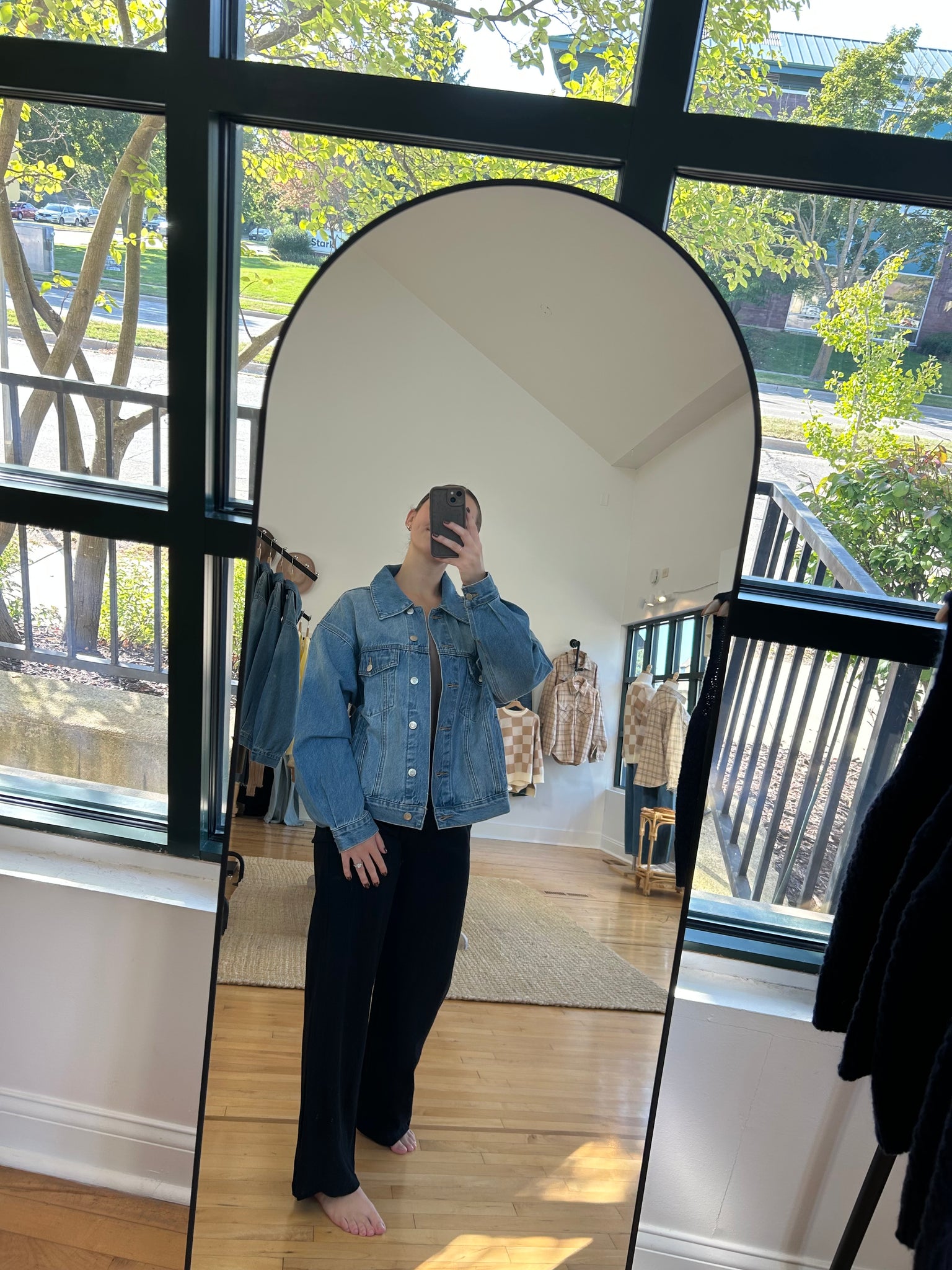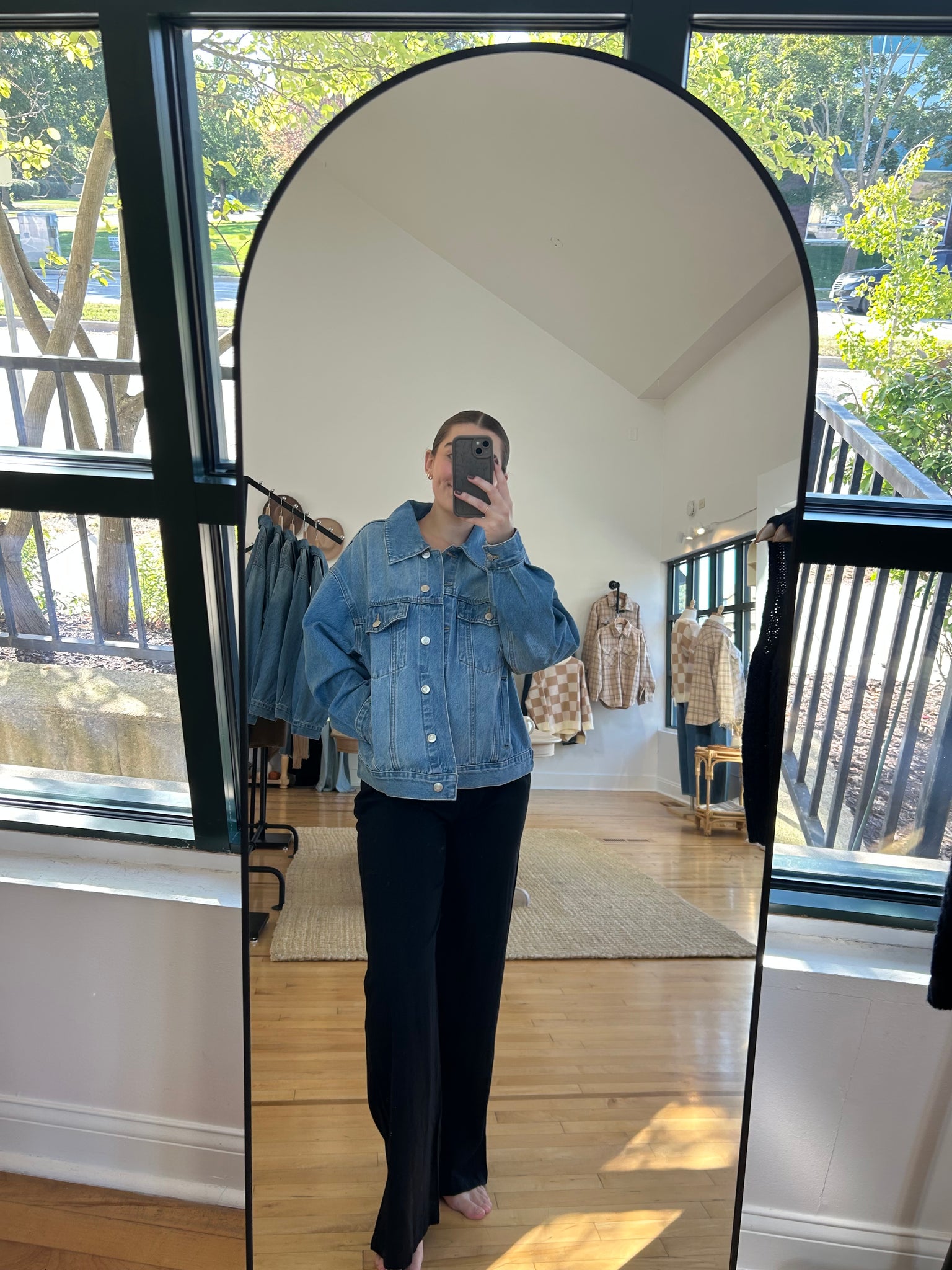 medium-wash, oversized button-down denim jacket