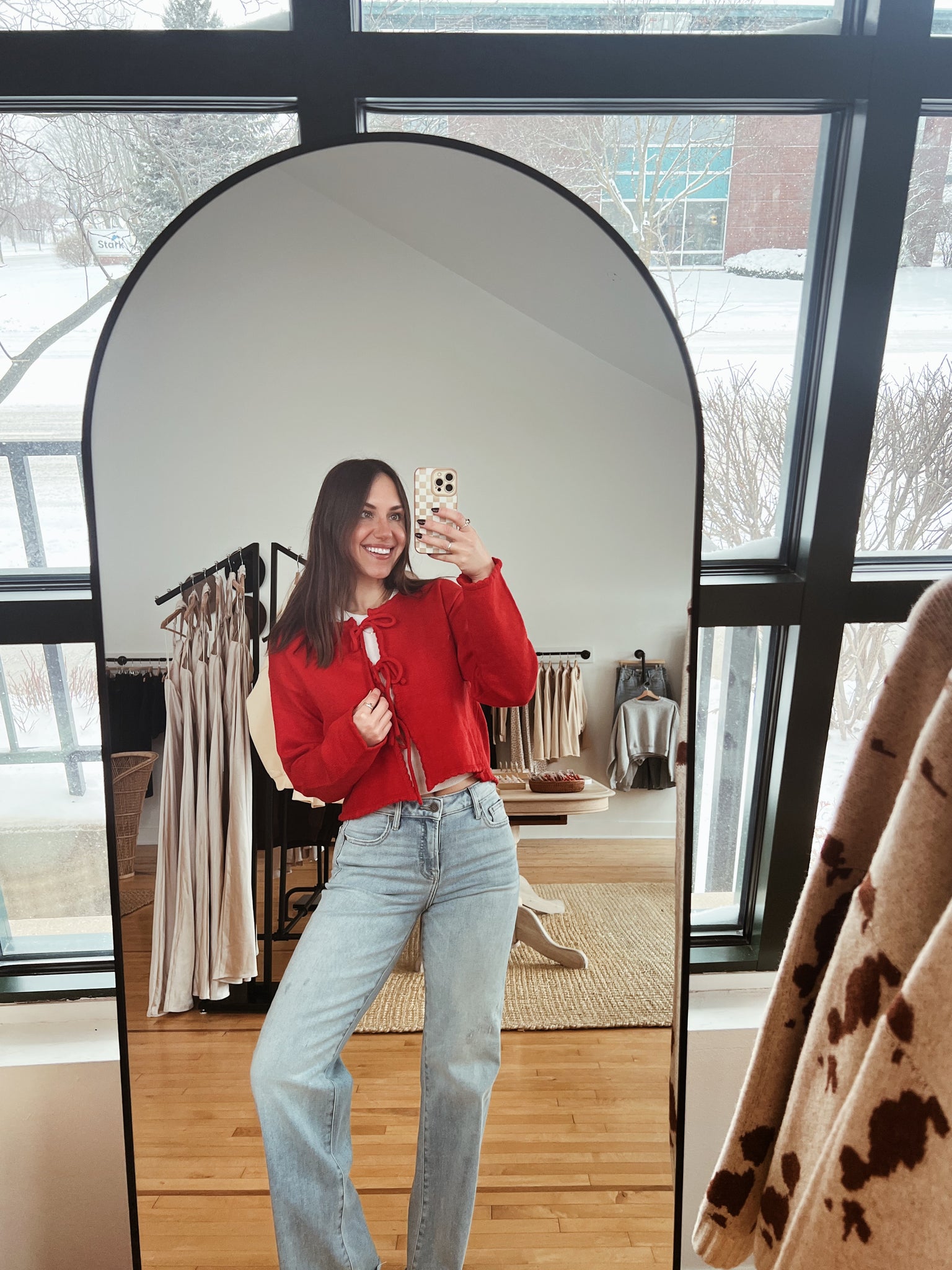 - lightweight red knit sweater with tie front, scallop trim detailing, and meet-and-greet silhouette