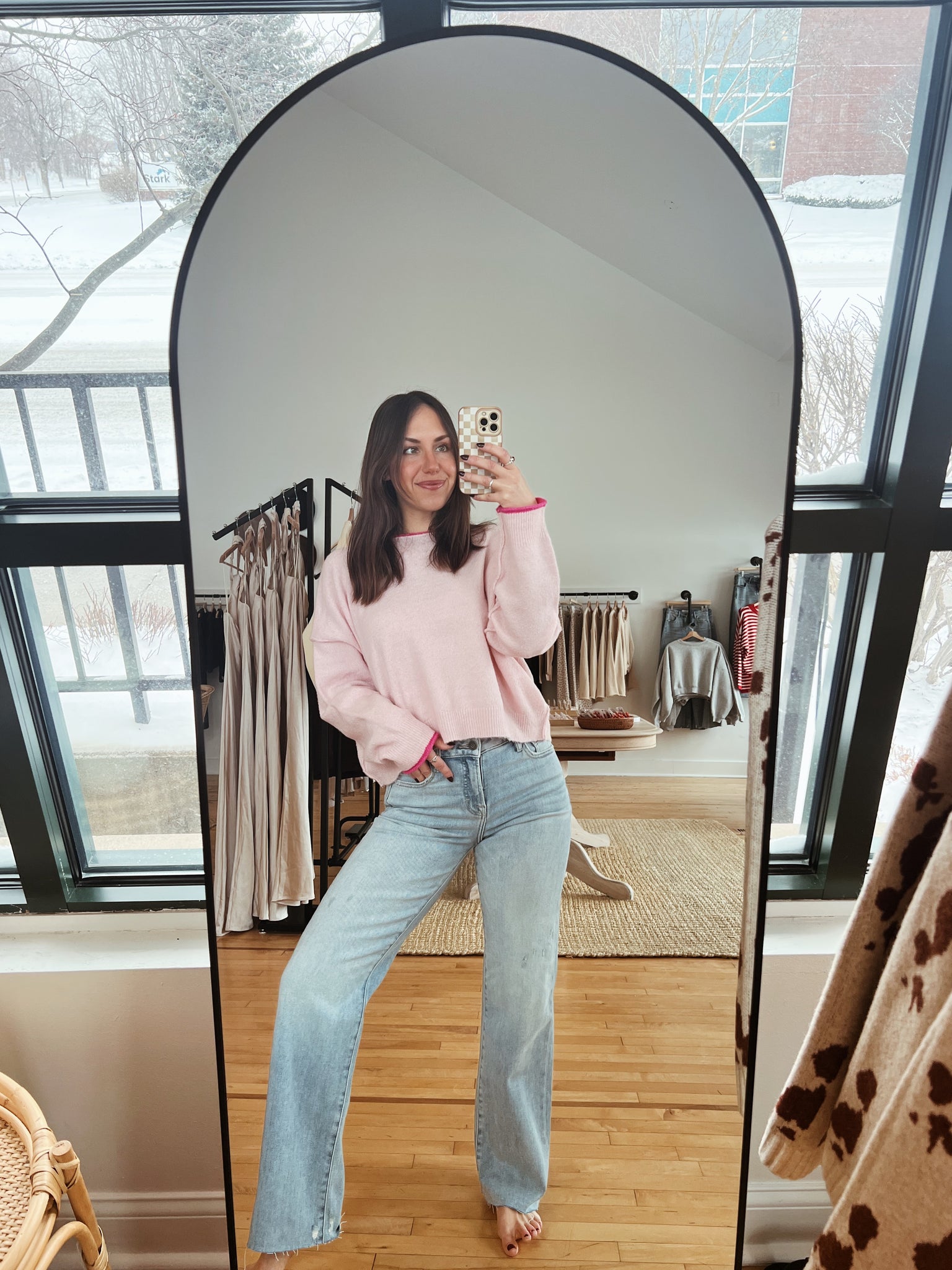 lightweight pink knit sweater with dropped shoulder, relaxed silhouette + color contrasted neckline + cuff details